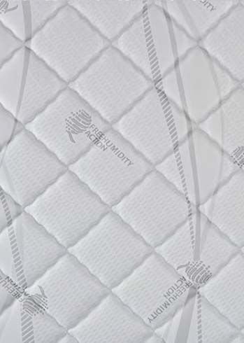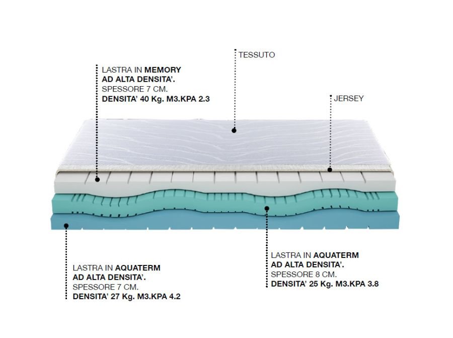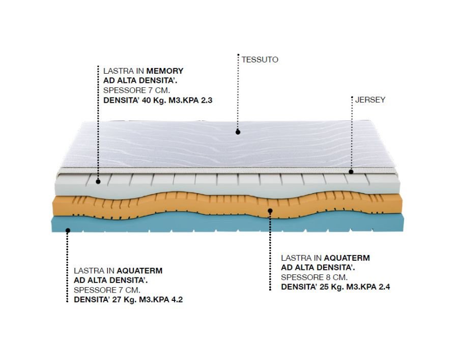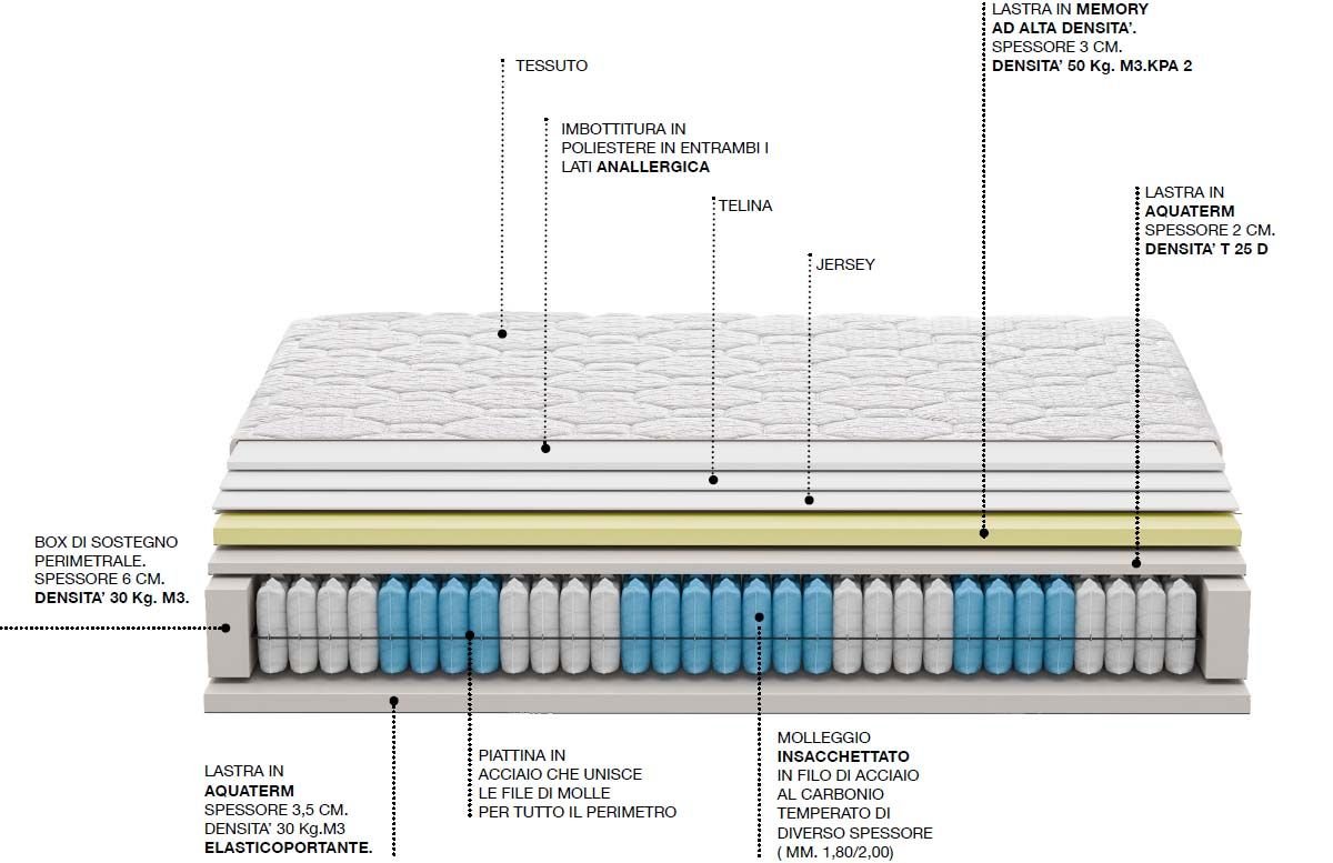 Lastra realizzata con molleggio insacchettato a 7 zone in filo di acciaio al carbonio temperato di diametro alternato 1,80 mm (Molla insacchettata bianca) 2,00 mm (Molla insacchettata celeste) che garantisce il miglior supporto ad ogni parte del corpo; elemento singolo 400 molle, matrimoniale oltre 800 molle, automodellanti, indipendenti e racchiuse singolarmente in una protezione di tessuto agugliato. Lo completano il sistema box di sostegno perimetrale in espanso indeformabile ad alta densità microforato per avere una efficacie traspirabilità e una lastra di Memory visco elastico sopra il molleggio ed una lastra in Aquaterm al di sotto della lastra.