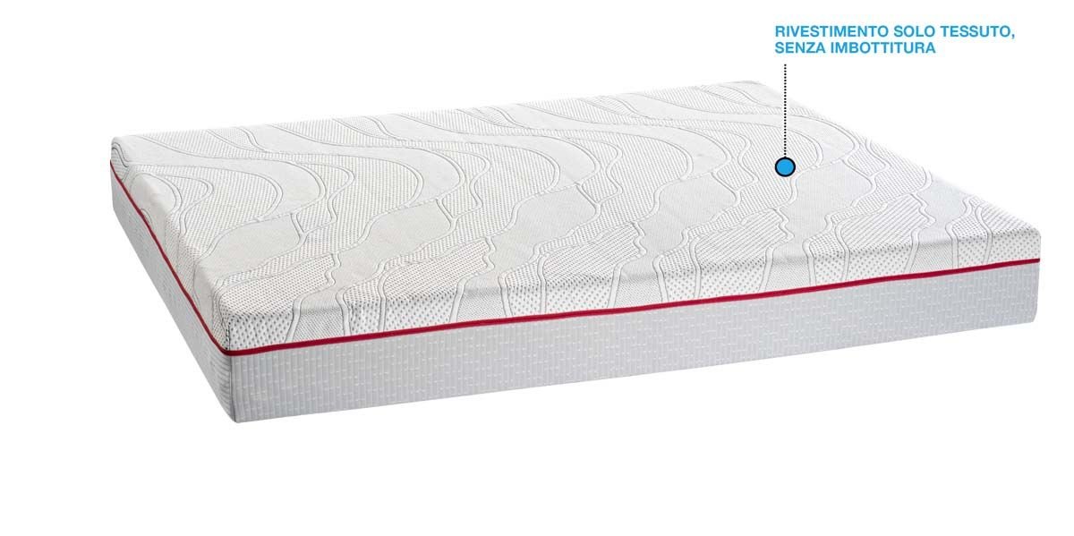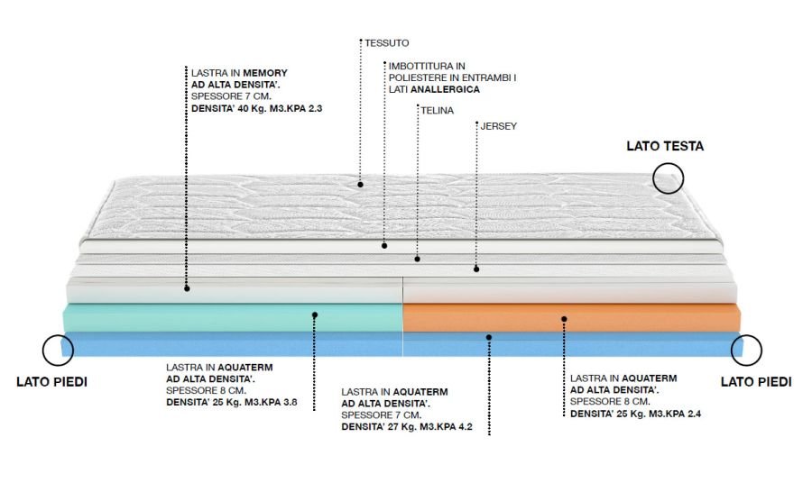 Lo completano il sistema box di sostegno perimetrale in espanso indeformabile ad alta densità microforato per avere una efficacie traspirabilità e una lastra di Memory visco elastico sopra il molleggio ed una lastra