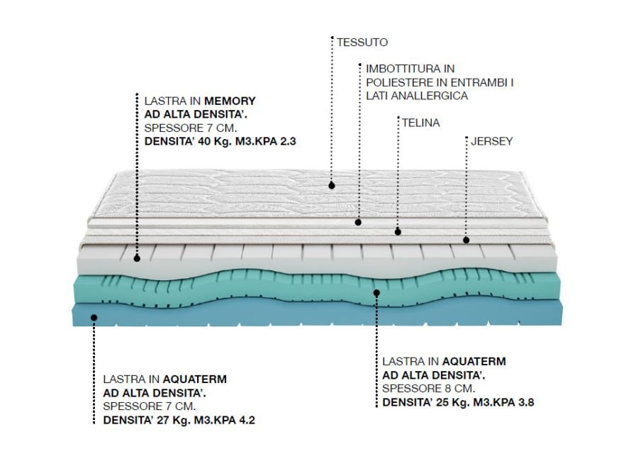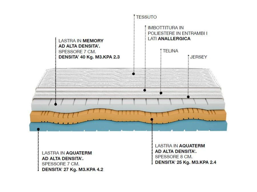 Dalla fusione di acqua e aria con polimeri innovativi e di tecnologia avanzata nasce AQUATERM, uno dei più avanzati materiali per le strutture interne dei materassi. AQUATERM è un prodotto di una elasticità unica nel suo genere. La struttura molecolare a celle aperte comunicanti, permette la libera circolazione dell’aria. La continua circolazione dell’aria tra gli spazi delle cellule assicura un totale microclima che diventa indispensabile per un perfetto riposo, con una deumidificazione costante e controllata. AQUATERM ci ha permesso di realizzare materassi ergonomici che si modellano intorno al nostro corpo in maniera graduale e differenziata.